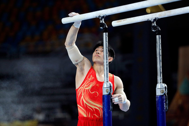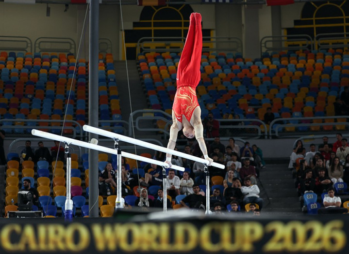 当地时间4月6日,2026年国际体联体操世界杯开罗站男子双杠决赛在埃及开罗举行。图/新华社