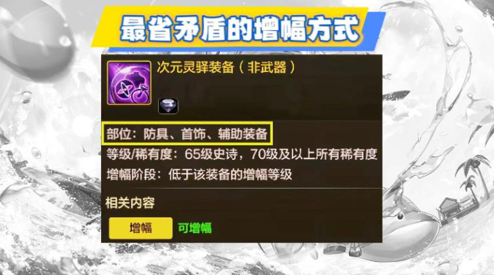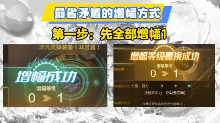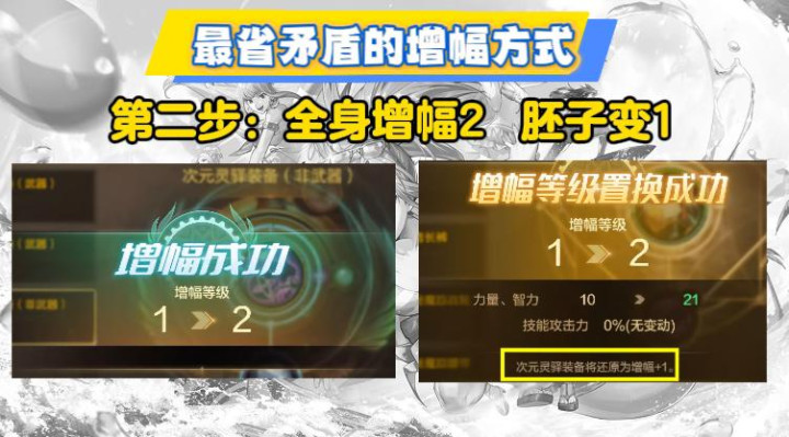 切记优先增幅武器!因为10件装备之中,仅武器可加双攻,而其余9个部位都是增加力智当然武器增幅消耗也高一些,不过依旧是最划算的部位。