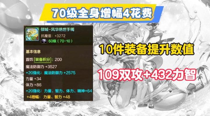 从70级装备系统分析,目前增幅4的性价比极高,碾压其余任何打造!全身增幅4可增加109点双攻+432力智,提升高达17.7%。