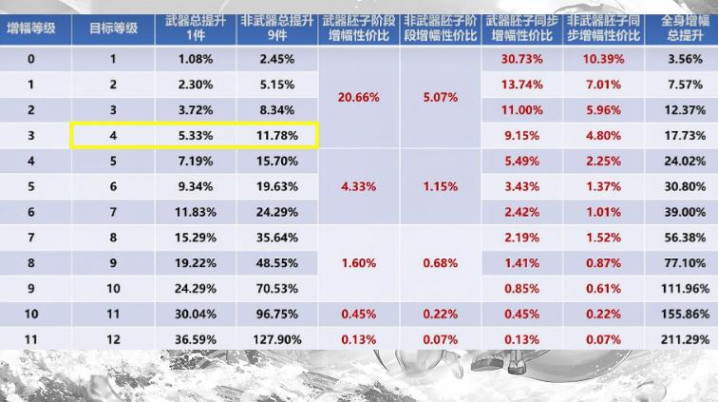 70级武器增幅4提升为5.33%,其余9个部位加起来也才11.78%,折合单件1.22%,武器相比其余9个部位差不多是4~5倍的提升,但矛盾花费还不到2倍,谁更划算不言而喻了!