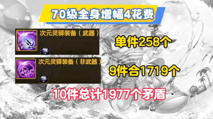 综上全身增幅4需要1977个矛盾,这也是为何主包说9月会全民开始增幅,就算你1个矛盾不买,平时靠70级副本掉落的角色绑定矛盾也能去增幅试试水。