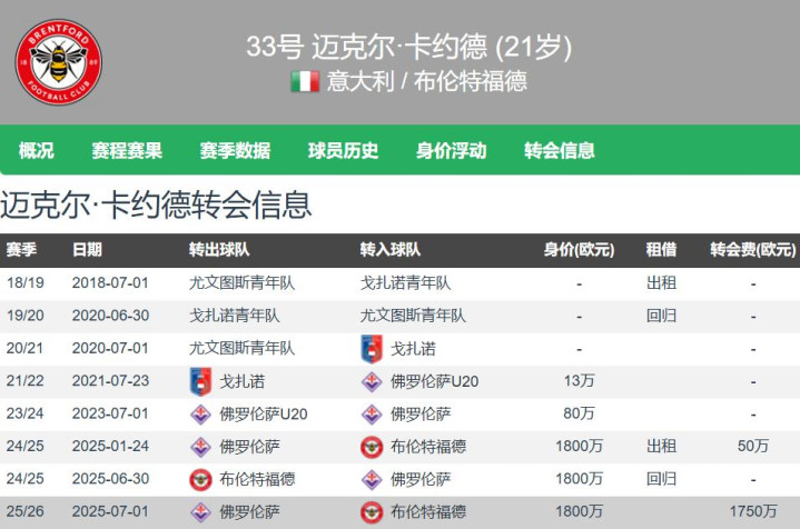 卡约德于今年夏窗以1750万欧元的转会费从佛罗伦萨加盟布伦特福德,还没有代表意大利一线队出场过,目前在布伦特福德的发展非常不错,激烈的英超联赛有助于意大利球员走出去获得成长。