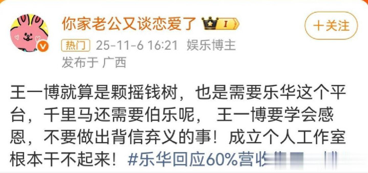 在娱乐产业的风云变幻中,乐华娱乐近期因一则关于营收占比的消息引发了广泛关注。有报道指出乐华60%的营收依赖于旗下艺人王一博,这一说法犹如一颗投入平静湖面的巨石,在资本市场和粉丝群体中激起了层层涟漪。对此,乐华迅速做出了回应,试图平息外界对于公司过度依赖单一艺人的质疑。