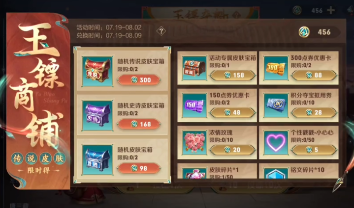 王者荣耀在最近上架的活动有很多,不仅有神秘商店,也有蔷薇珍宝阁,更有限时点券商城上架。另外呢,王者荣耀在9月份中,还会有玉镖夺魁开启。要知道,这个活动已经有两三年没有返场了。十连抽至少能获得一款永久皮肤,而且只需600点券。所以,这个活动被很多玩家用来收集皮肤,同时有多余的玉镖币的玩家,还可以兑换传说皮肤,或者其他道具奖励哦。在我看来,玉镖夺魁还是挺良心的一个活动,尤其是那些氪金玩家,想要收集皮肤的玩家,要记得多备好点券哈。
