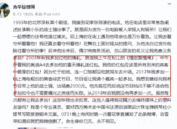 也是自那时起,只要有战士强在,池华琼便不再参与《十六岁的花季》剧组的聚会了。不仅如此,曾经的友谊也在心中划开了一道深深的裂痕。
