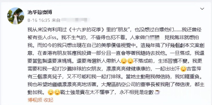一波未平一波又起。今年《十六岁的花季》剧组聚会时,池华琼在社交媒体上的一席话直接引爆了舆论,“这些年大家各走各路,有人忙着直播带货,不是同道中人,确实没多少话题聊。”