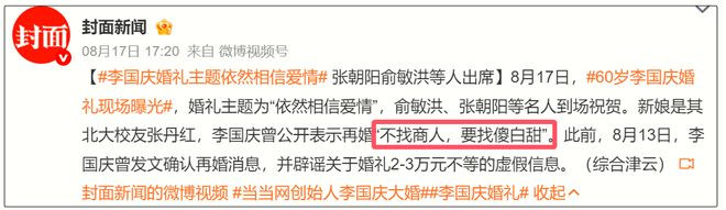 自己是傻白甜,李国庆再婚的择偶条件也是:不找伤人,要找傻白甜。
