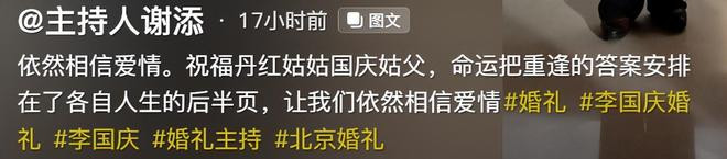 婚礼的主持人是张丹红的侄子,他晒出现场的照片。张丹红穿着鲜红色的敬酒服站在C位,绝对的控场能手。侄子说:依然相信爱情,祝福丹红姑父和国庆姑父,命运把重逢答案安排在了各自人生的后半页,让我们依然相信爱情。