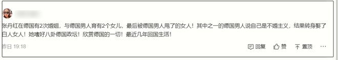 59岁的张丹红,毕业后就去了德国工作,如今已是德国籍。虽然曾因为中国发声,遭德国媒体抨击,依然选择留在德国。她一共有两段婚姻,其中一位前夫自称是丁克,和张丹红离婚后转身娶了别人生小孩。