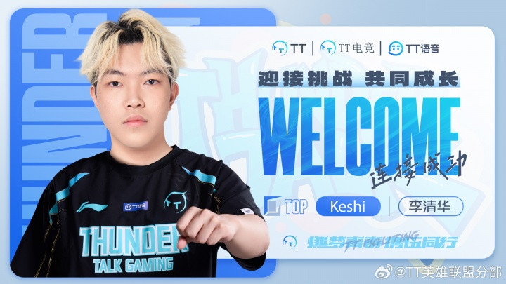 清华上单! TT官方: 选手李清华(前BLG.J上单Keshi)正式入队